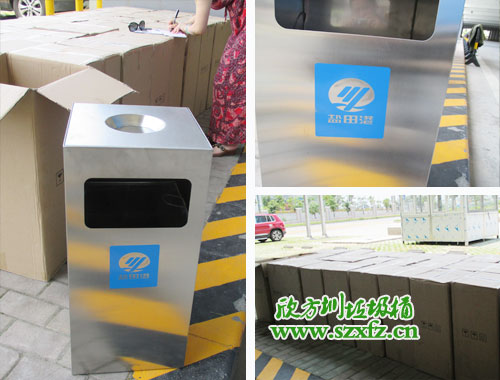 本款不銹鋼垃圾桶是按照貴司的常規(guī)熱銷款C60方形不銹鋼果皮箱改造而來的,其規(guī)格為:350*350*680mm。不銹鋼垃圾桶外觀不銹鋼色澤,常規(guī)不銹鋼垃圾桶桶部上面絲印有禁煙標(biāo)志,按照顧客的要求改造為桶上方凹圓形槽,用于裝置煙灰頭。不銹鋼垃圾桶桶的正面,旁邊用藍(lán)色搭配絲印,鹽田港三個字及LOGO跟不銹鋼垃圾桶色澤一致,金屬亮澤 ,高雅美觀。
