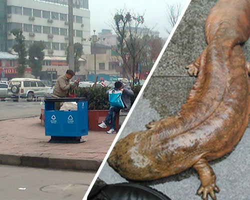 成都火車東站廣場外圍滿了人,大家都好奇地看著在地上爬來爬去的4個小家伙,它們可不是普通動物,而是國家二級保護動物——娃娃魚。它們的來歷撲朔迷離,據(jù)說是環(huán)衛(wèi)工在打掃垃圾桶時,從一個塑料袋里翻出來的,究竟是何人所丟不得而知。現(xiàn)在4條娃娃魚被送往成都動物園,暫未有發(fā)現(xiàn)不適現(xiàn)象。