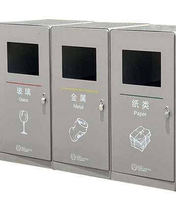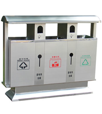 深圳新標準城中村街道社區不銹鋼五分類垃圾桶由有害垃圾、玻璃、金塑紙(為金屬、塑料、紙張的簡稱)、廚余垃圾、其他垃圾這5分類不銹鋼垃圾桶組合而成。其中金塑紙、其他垃圾日常產生量較大,所以分類收集容器也