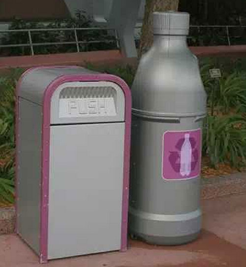 在奧蘭多迪士尼未來世界,垃圾箱與周圍銀灰色建筑完美融合,雖然造型上平淡乏味,好在瓶子足夠醒目。