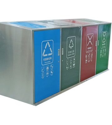 小區垃圾分類站點四類垃圾分類垃圾桶,不銹鋼無疑是較為理想的材質。它戶外防銹蝕效果好,表面金屬光澤高檔美觀,污漬也易清理。不銹鋼分類桶產品款式造型易定制,不受尺寸大小限制,滿足個性化需求,擺放于惠