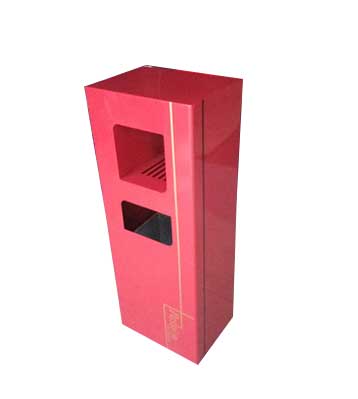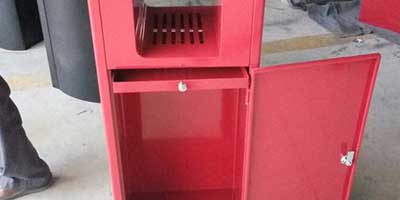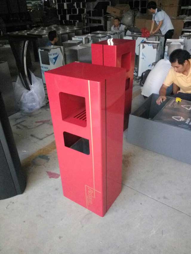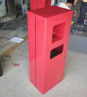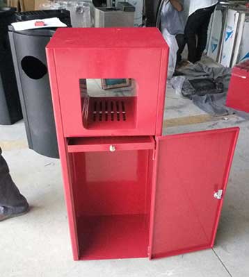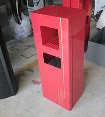 欣方圳鋼板沖孔室內單桶中國紅噴塑造型,側面開門以保證不影響美觀,也方便工人方便清理垃圾