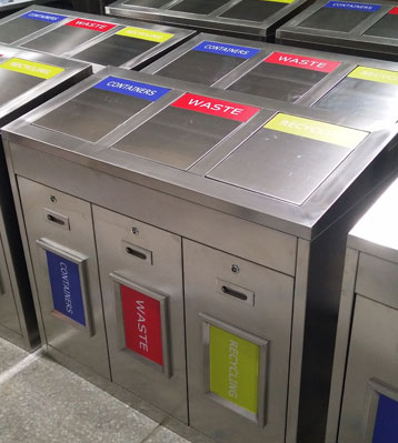 • 使用范圍:不銹鋼三分類垃圾回收箱表面光滑、亮麗,是電梯口、寫字樓、學校、物業、賓館、酒店、機場、汽車站等擺放的首選。