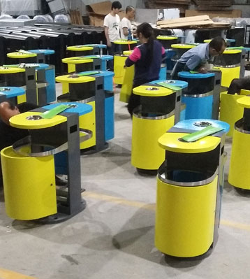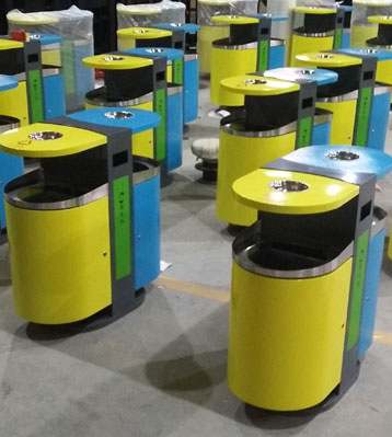 • 產品材質:欣方圳不銹鋼戶外果皮箱采用不銹鋼材質經剪鈑下料,折彎、沖壓、焊接、打磨、等工藝: 表面經過除油、噴砂防銹處理后,再進行酸洗磷化處理;表面清理干燥后整體進行靜電噴涂,涂層厚度達到 90um,經過流水線高溫固化爐固化后再出爐冷卻,加工后的塑粉附著力強,不易剝落;