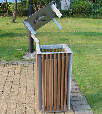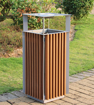 桶頭中間嵌入不銹鋼煙灰盅收集煙蒂及滅煙,采用單支點后翻設計,這樣打開操作空間更大更便于取出內桶清運垃圾及殘留物,冷板噴塑PS仿木做防銹。