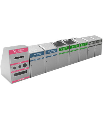 含可回收物、廚余垃圾、有害垃圾、其他垃圾4分類垃圾組成,不銹鋼沖孔社區垃圾分類收集站共8個垃圾分類箱可用于社區垃圾量大分類收集使用,絲印新版垃圾分類圖標大氣美觀。分類投口提手設計垃圾投放方便,頂蓋復位可防異味散發!