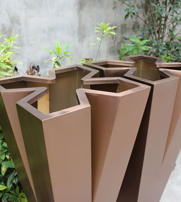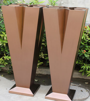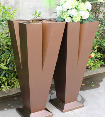 • 產品材質:不銹鋼高V字形美陳花器電鍍花盆可采用5mm加厚201#/202#/304#不銹鋼材料模壓或焊接成型,金屬亮澤,內外表面光潔,易于清潔,表面可做電鍍壓紋、水鍍、蝕刻、納米鎳、無氰堿性光亮鍍銅工藝效果,無指紋處理高檔大氣;